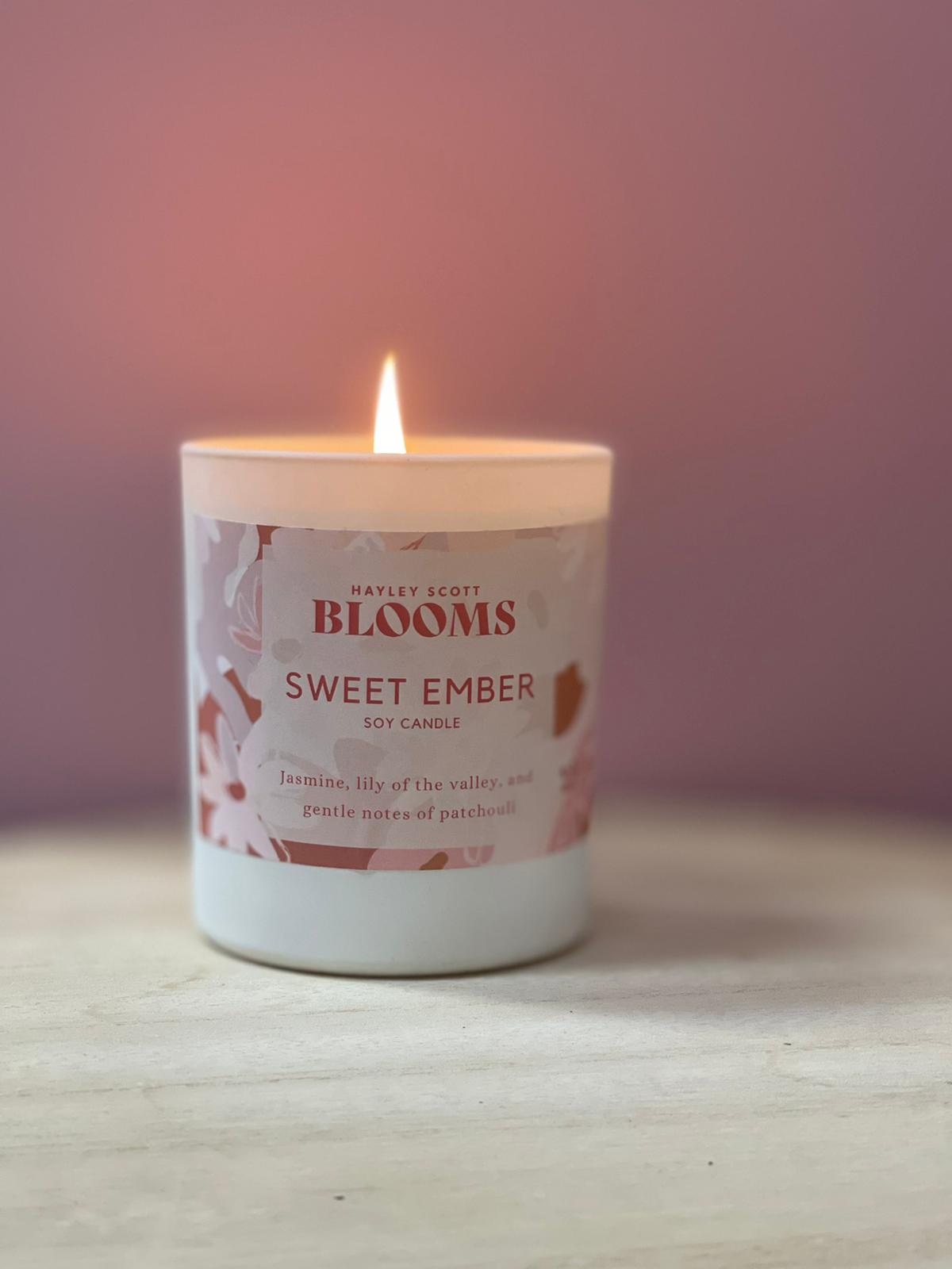 Our handmade soy candle is our first ever Hayley Scott Blooms official fragrance, SWEET EMBER. Made in Cornwall in collaboration with La Luna Candles and complete with white ceramic container.